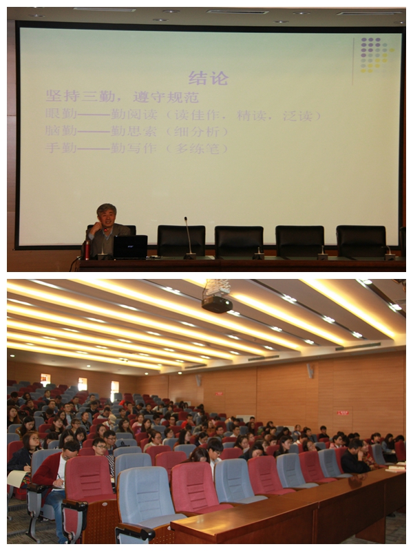 首先,白教授阐释了研究生的含义、主要任务以及论文写作的重要性以及论文写作的内容和形式。随后,白教授从论文的选题、研究综述、研究方法、结构与铺陈、摘要关键词与引言、学术规范问题六个方面,结合具体的例子,就如何写好一篇论文进行详尽而深入的讲解。在梳理文献资料方面,他特别强调:“做学术梳理最好保持一种平等而开放的态度,对他人的研究表示充分的理解与尊重。”最后,白教授表示学术规范问题是论文写作中极其需要注意的问题,告诫同学们应该坚守史德、杜绝抄袭、努力创新,坚持眼勤、脑勤、手勤。