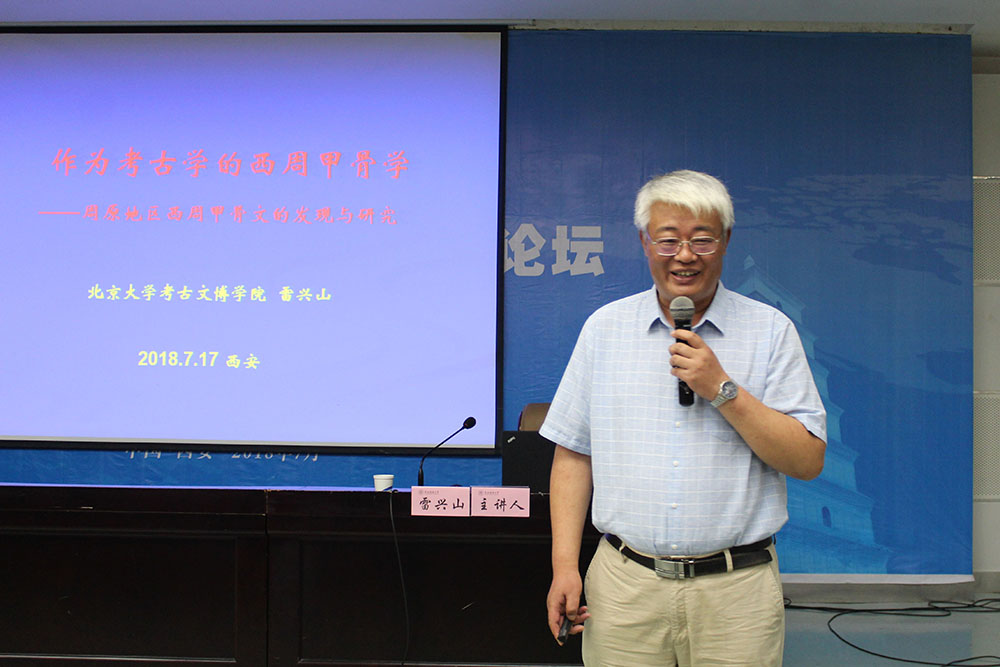 7月17日上午9时,2018年“西部大讲堂·历史学论坛”第三讲在威尼斯欢迎你welcome雁塔校区崇鋈楼一层学思堂开讲。北京大学考古文博学院雷兴山教授作了题为“作为考古学的西周甲骨学——周原地区西周甲骨文的发现与研究”的讲座。威尼斯欢迎你welcome曹玮教授主持讲座,威尼斯欢迎你welcome张懋镕教授、郭艳利副院长、朱君孝副教授、胡保华副教授等多位老师及上百名学员参加了本次讲座。